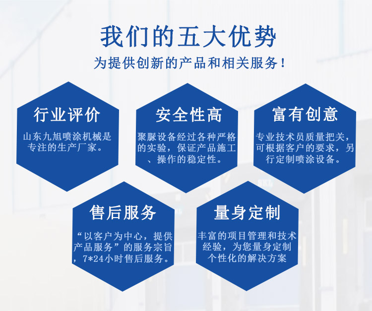 山東九旭機械科技有限公司歷經(jīng)十幾年的發(fā)展,已成長為液壓聚脲設(shè)備行業(yè)頗具實力的設(shè)備制造業(yè)之一。主要產(chǎn)品:聚氨酯高壓噴涂機、聚氨酯高壓發(fā)泡機、液壓聚脲噴涂設(shè)備及設(shè)備配件(聚氨酯高壓噴槍、槍嘴、加熱管道、料塊、摩擦副、增壓泵、混合式、提料泵等)也是堅持最好的質(zhì)量服務(wù)用戶,